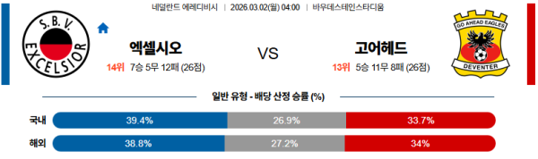 엑셀시오르:고어헤드이글스 에레디비지 03월02일 분석 및 예측 스포츠중계:스포츠무료중계