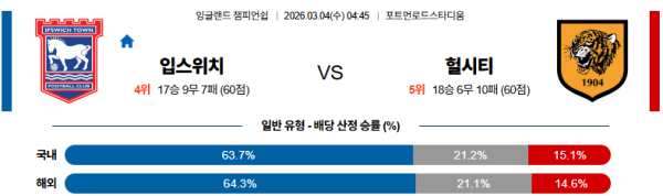 입스위치:헐시티 잉글랜드챔피언쉽 03월04일 분석 및 예측 스포츠중계:스포츠무료중계