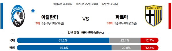 01월25일 아탈란타:파르마 세리에A 분석 및 예측 스포츠중계:스포츠무료중계