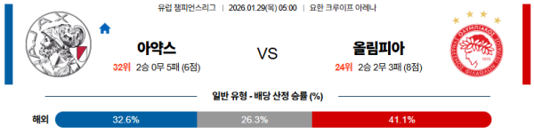 01월29일 아약스:올림피아코스 UEFA챔피언스리그 분석 및 예측 스포츠중계:스포츠무료중계