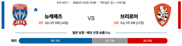 01월31일 뉴캐슬제츠:브리즈번로어 호주A리그 분석 및 예측 스포츠중계:스포츠무료중계