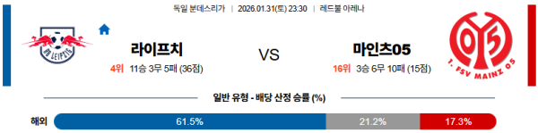 01월31일 라이프치히:마인츠 분데스리가 분석 및 예측 스포츠중계:스포츠무료중계