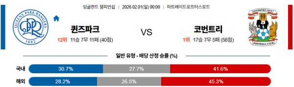 02월01일 QPR:코번트리 잉글랜드챔피언쉽 분석 및 예측 스포츠중계:스포츠무료중계
