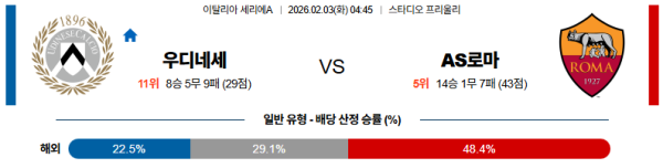 02월03일 우디네세:AS로마 세리에A 분석 및 예측 스포츠중계:스포츠무료중계