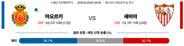 02월03일 마요르카:세비야 라리가 분석 및 예측 스포츠중계:스포츠무료중계