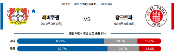02월04일 레버쿠젠:장크트파울리 독일FA컵 분석 및 예측 스포츠중계:스포츠무료중계