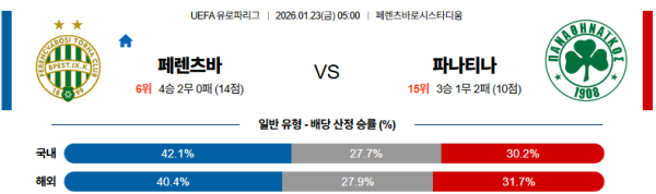 01월23일 페렌츠바로시:파나시나이코스 UEFA유로파리그 분석 및 예측 스포츠중계:스포츠무료중계