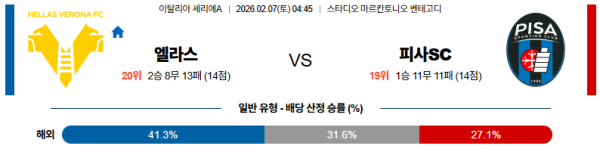02월07일 엘라스베로나:피사 세리에A 분석 및 예측 스포츠중계:스포츠무료중계