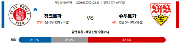 02월07일 장크트파울리:슈투트가르트 분데스리가 분석 및 예측 스포츠중계:스포츠무료중계
