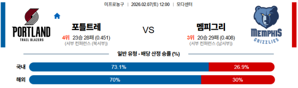 02월07일 포틀랜드:멤피스 NBA 분석 및 예측 스포츠중계:스포츠무료중계