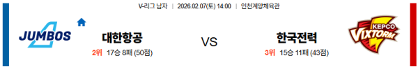 02월07일 대한항공:한국전력 V리그 분석 및 예측 스포츠중계:스포츠무료중계