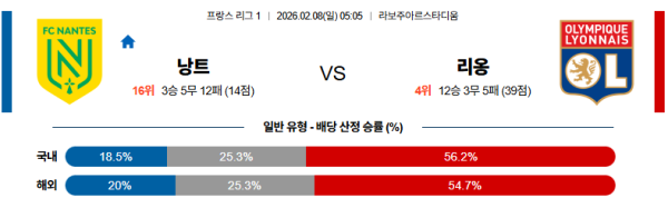 02월08일 낭트:리옹 리그앙 분석 및 예측 스포츠중계:스포츠무료중계