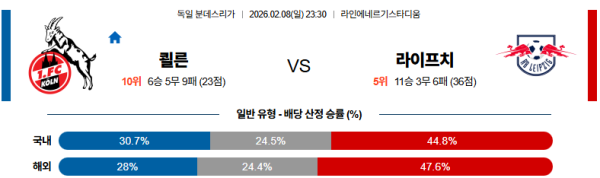 02월08일 쾰른:라이프치히 분데스리가 분석 및 예측 스포츠중계:스포츠무료중계