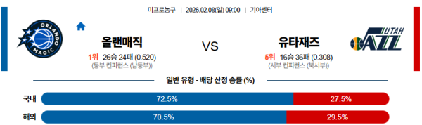 02월08일 올랜도:유타 NBA 분석 및 예측 스포츠중계:스포츠무료중계