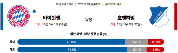 02월09일 바이에른뮌헨:호펜하임 분데스리가 분석 및 예측 스포츠중계:스포츠무료중계