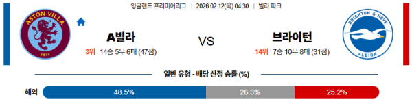 02월12일 아스톤빌라:브라이튼 프리미어리그 분석 및 예측 스포츠중계:스포츠무료중계