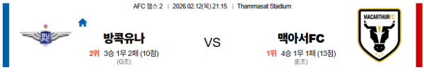 02월12일 방콕:맥아서 AFC챔피언스리그2 분석 및 예측 스포츠중계:스포츠무료중계
