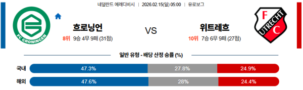 02월15일 흐로닝언:위트레흐트 에레디비지 분석 및 예측 스포츠중계:스포츠무료중계