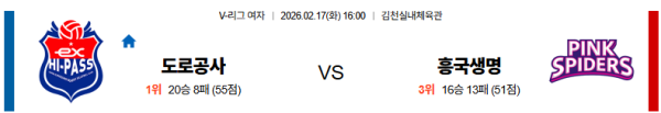 02월17일 한국도로공사:흥국생명 V리그(여) 분석 및 예측 스포츠중계:스포츠무료중계