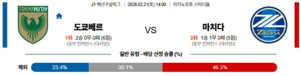 도쿄베르디:마치다 J리그백년구상리그 02월21일 분석 및 예측 스포츠중계:스포츠무료중계