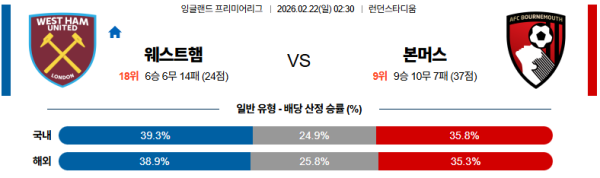 웨스트햄:본머스 프리미어리그 02월22일 분석 및 예측 스포츠중계:스포츠무료중계