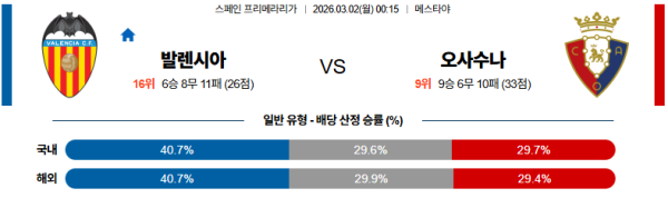발렌시아:오사수나 라리가 03월02일 분석 및 예측 스포츠중계:스포츠무료중계